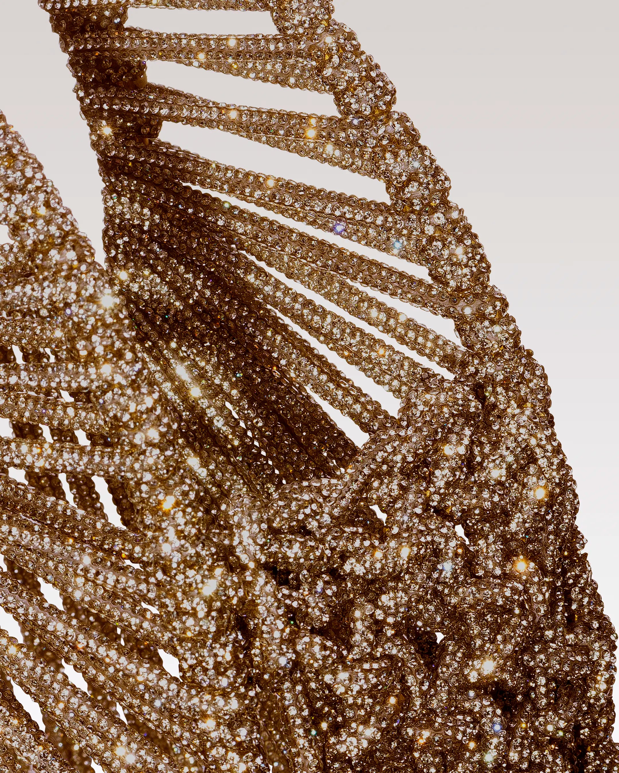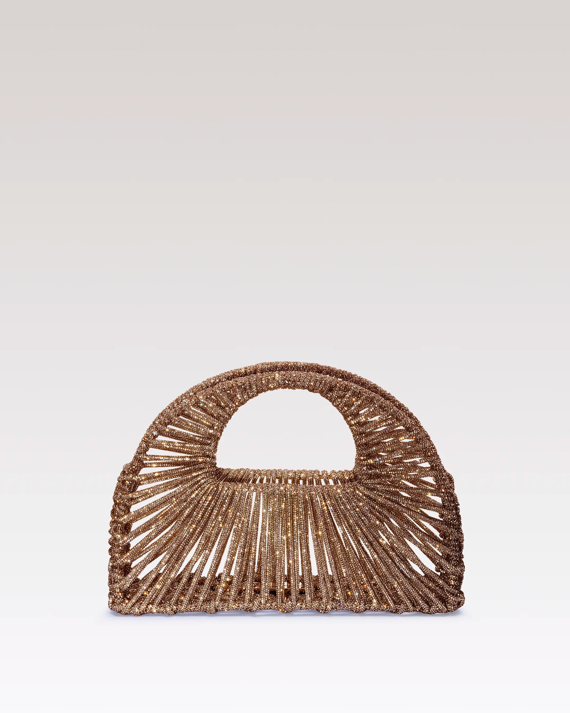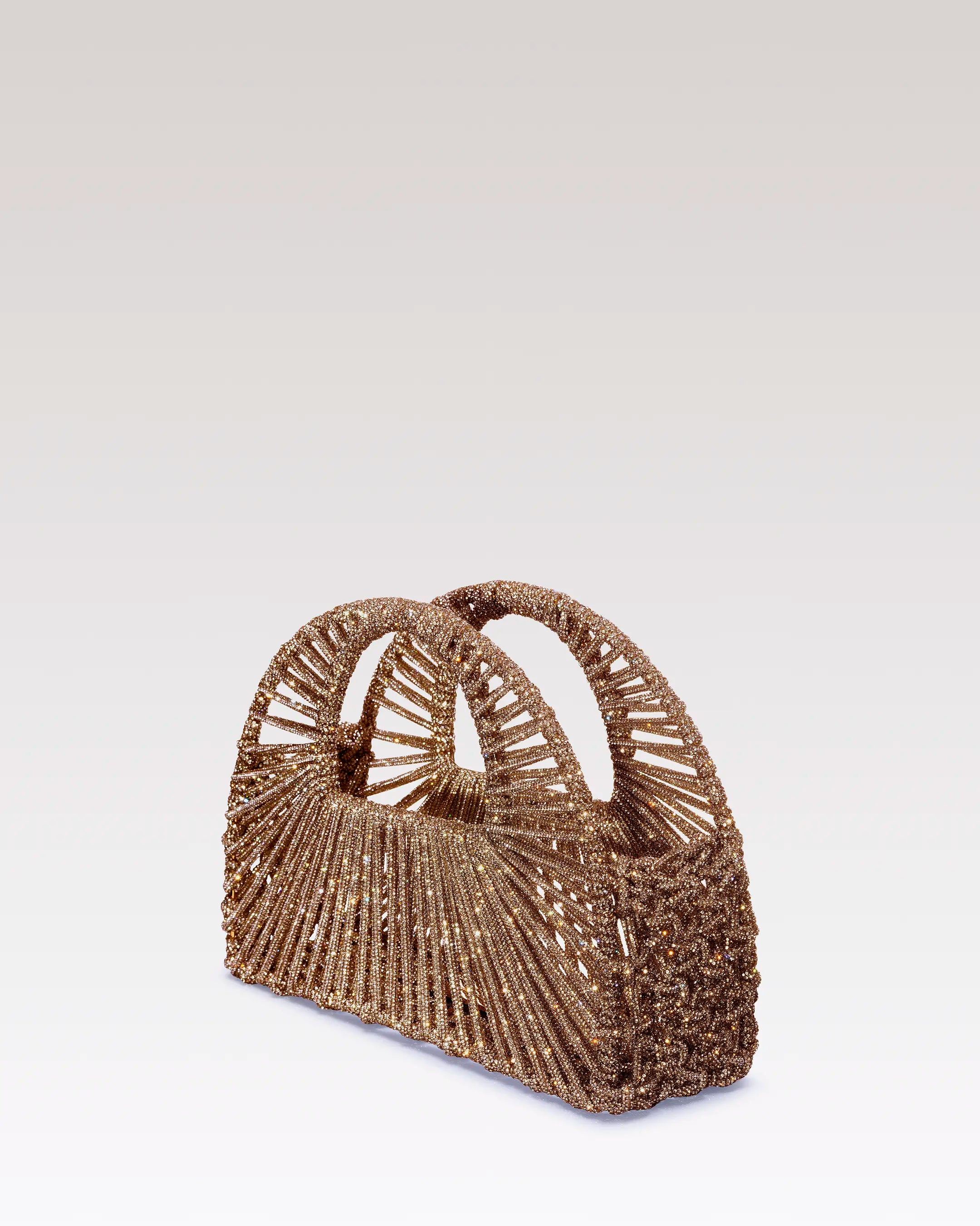The Dafne jewel bag is this season’s new must-have accessory. Entirely handmade, it blends craftsmanship with ultra-chic design. Its semi-circular shape and sparkling crystals make it perfect to shine at any special occasion.