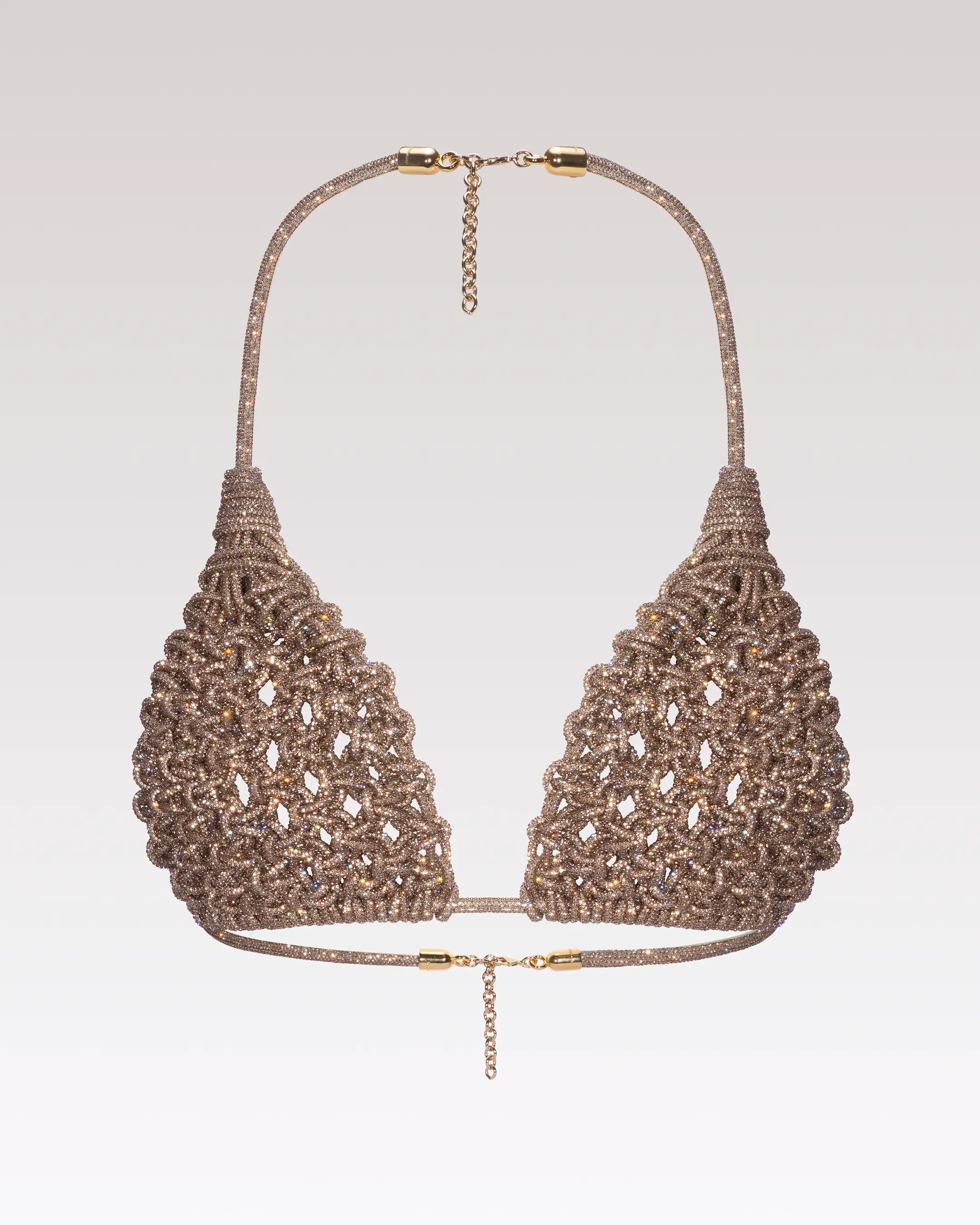 From the collaboration of the two brands Hibourama and MVP Wardrobe comes the ''Diamond Bra,'' the jeweled bra made entirely by hand according to a fine weaving technique. Its design is able to embellish any look by creating unusual contrasting effects. The yarn covered with precious crystals illuminates the model.