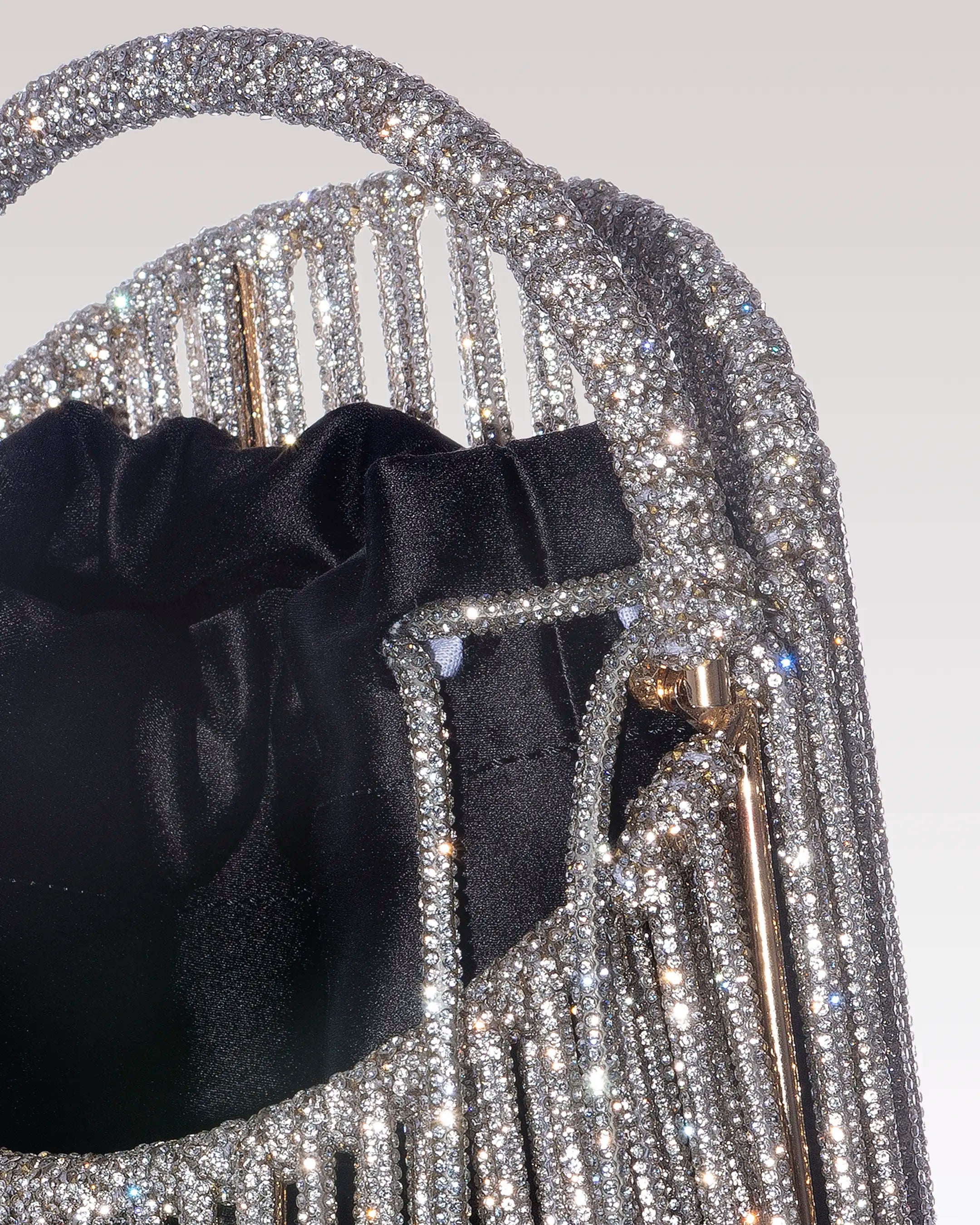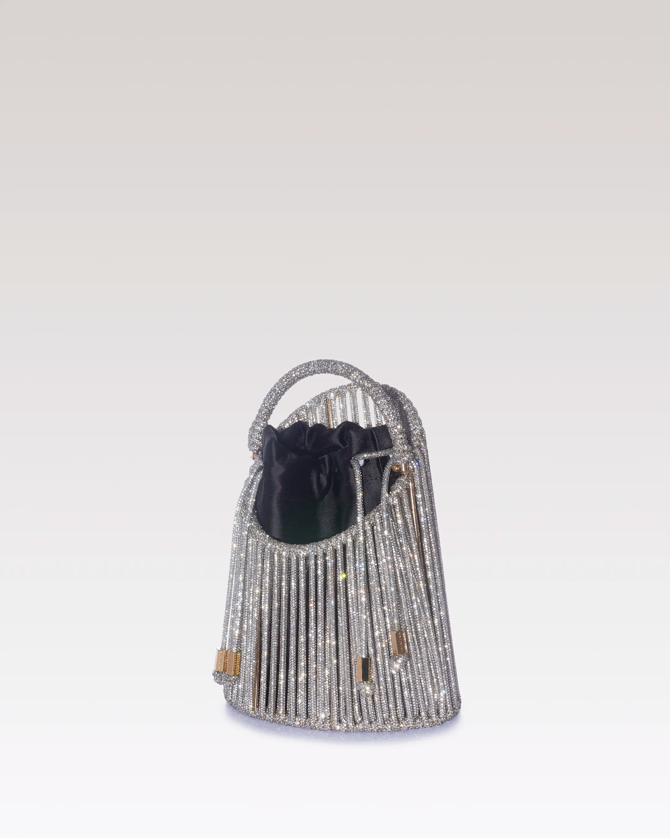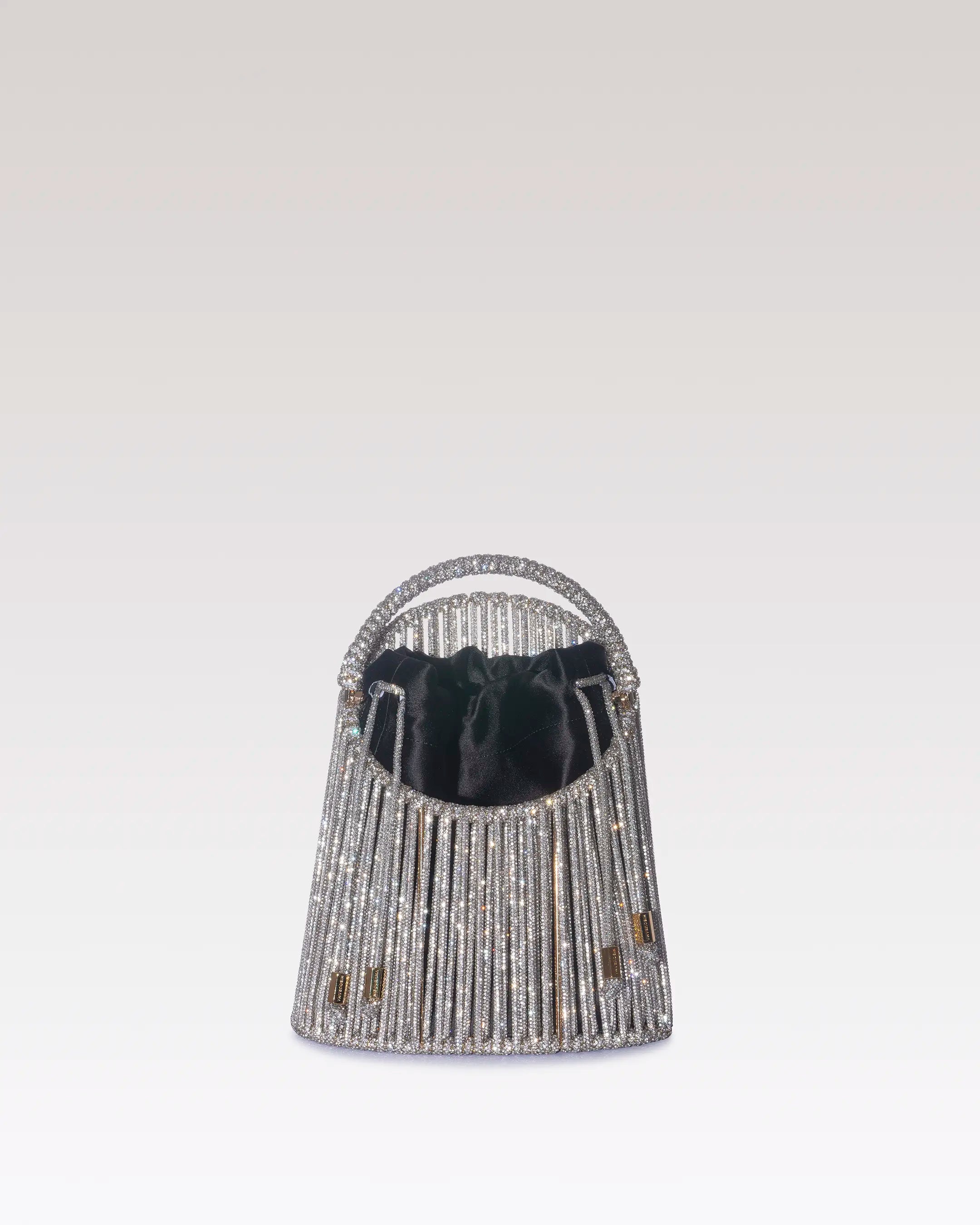 La borsa gioiello Elettra Bucket si distingue per la sua struttura scultorea e contemporanea. Realizzata interamente a mano con una pregiata tecnica di intreccio, è impreziosita da un filato ricoperto di cristalli che riflettono la luce con eleganza. All’interno, un raffinato pouch in seta aggiunge leggerezza e luminosità, completando un design che fonde rigore architettonico e sofisticata femminilità.