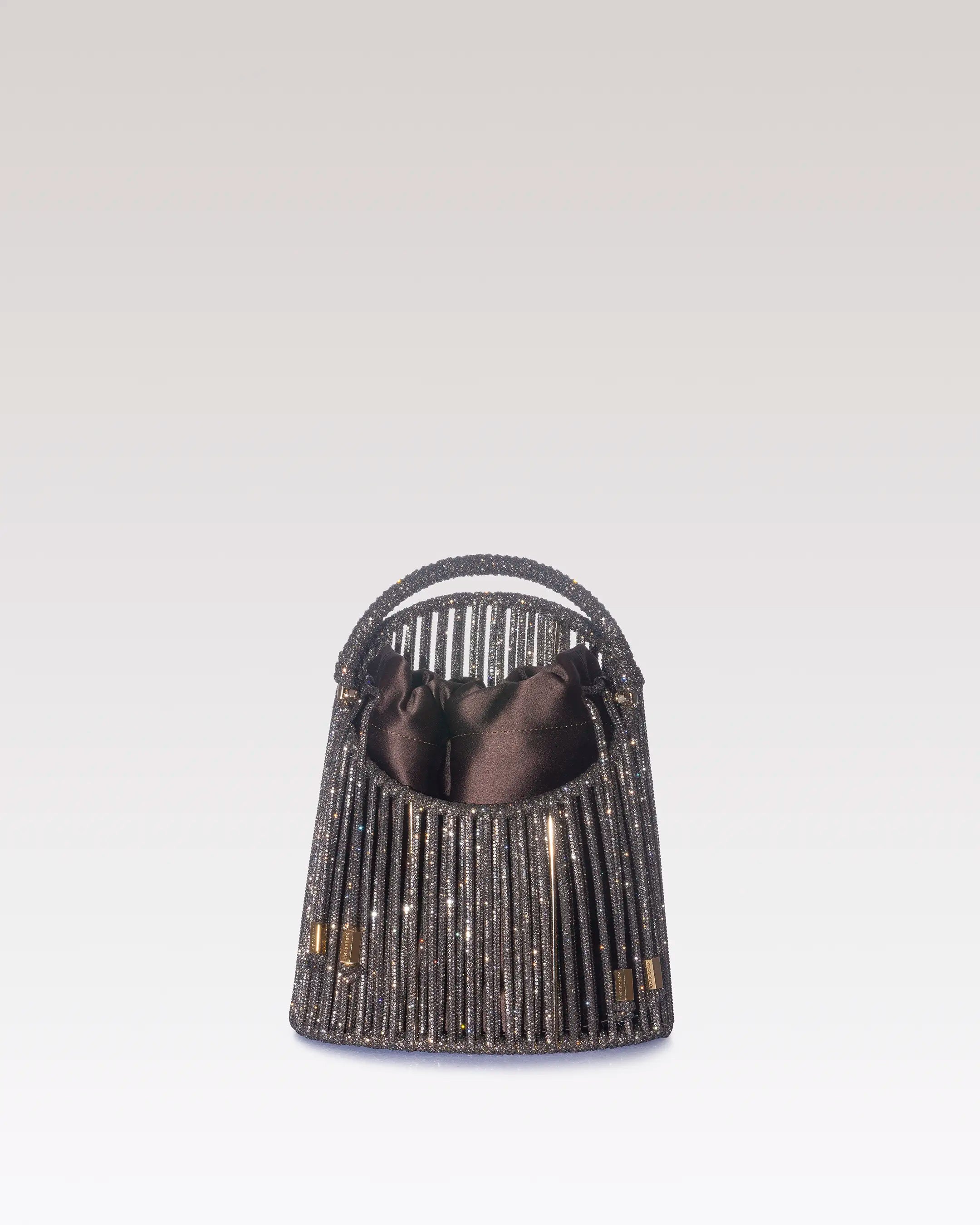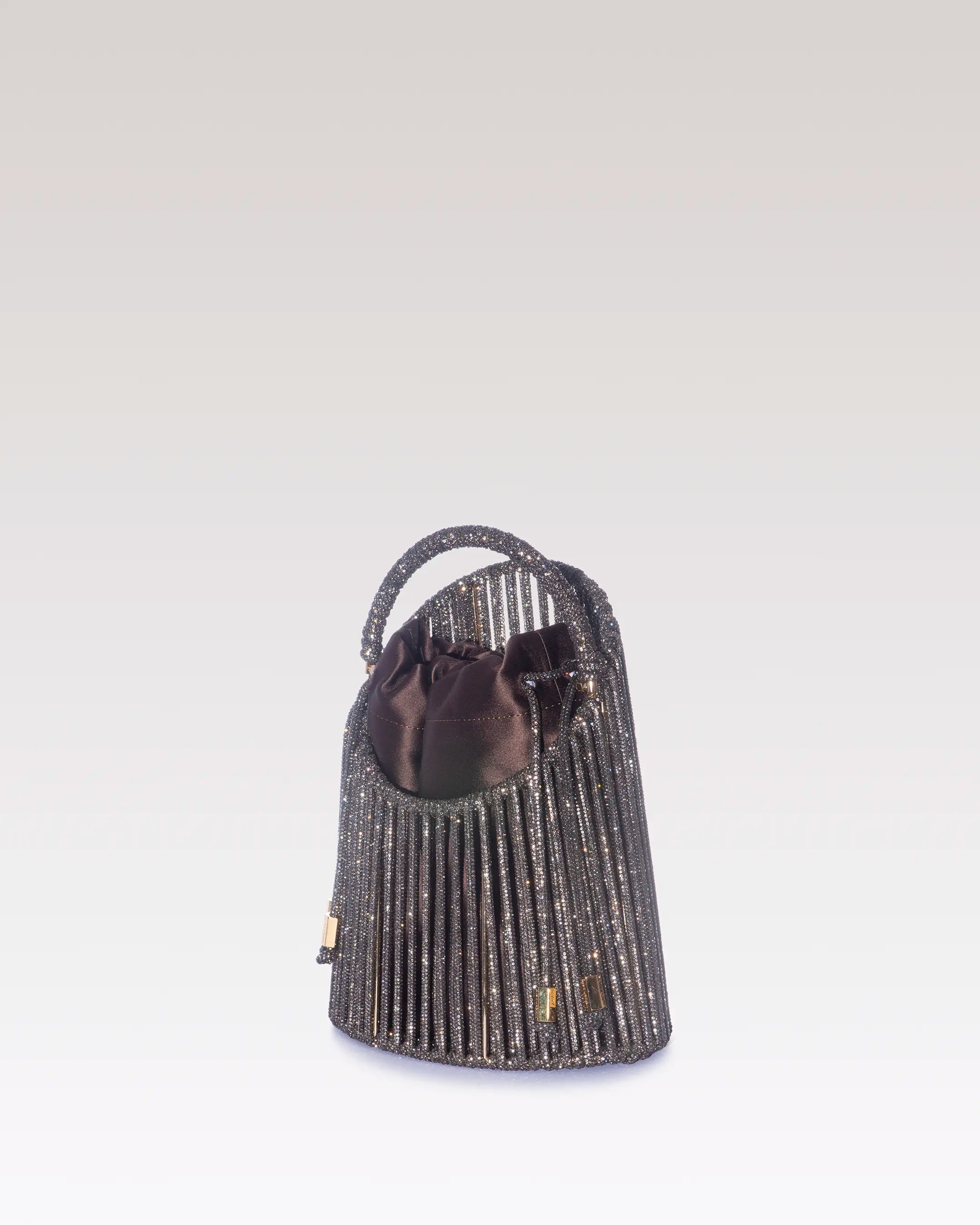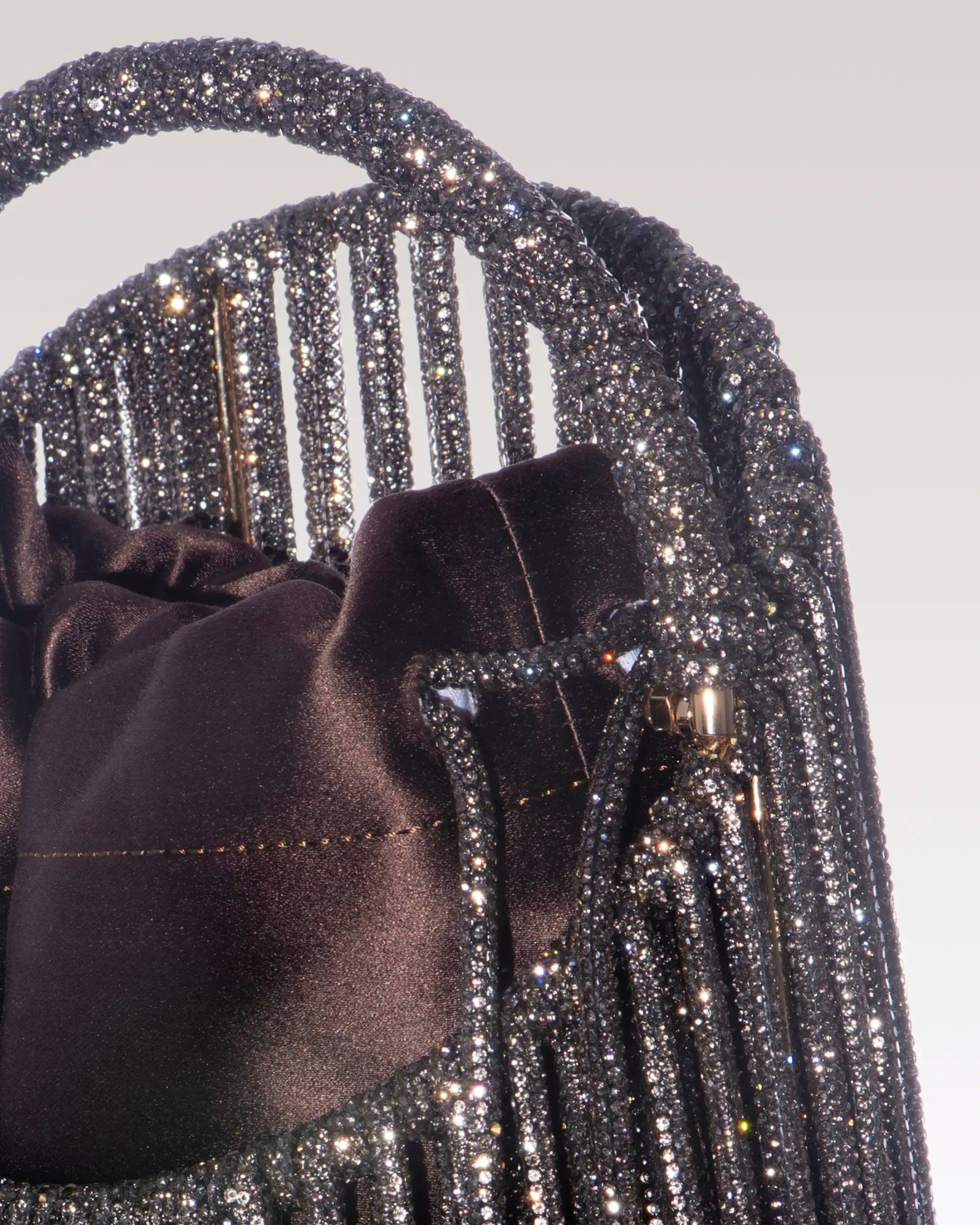 La borsa gioiello Elettra Bucket si distingue per la sua struttura scultorea e contemporanea. Realizzata interamente a mano con una pregiata tecnica di intreccio, è impreziosita da un filato ricoperto di cristalli che riflettono la luce con eleganza. All’interno, un raffinato pouch in seta aggiunge leggerezza e luminosità, completando un design che fonde rigore architettonico e sofisticata femminilità.