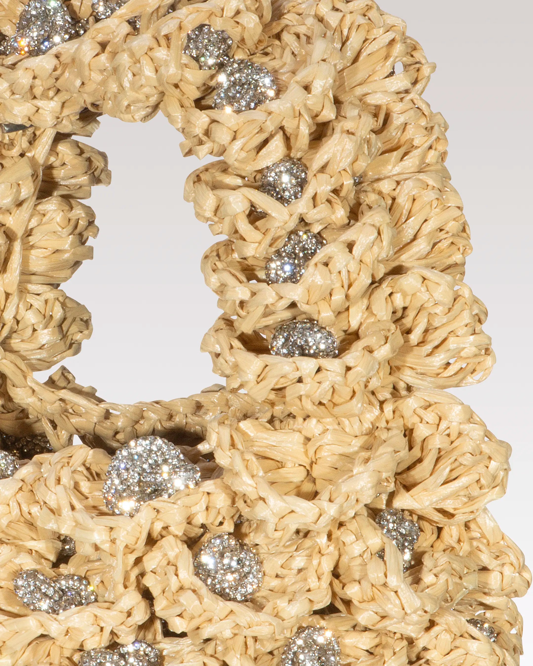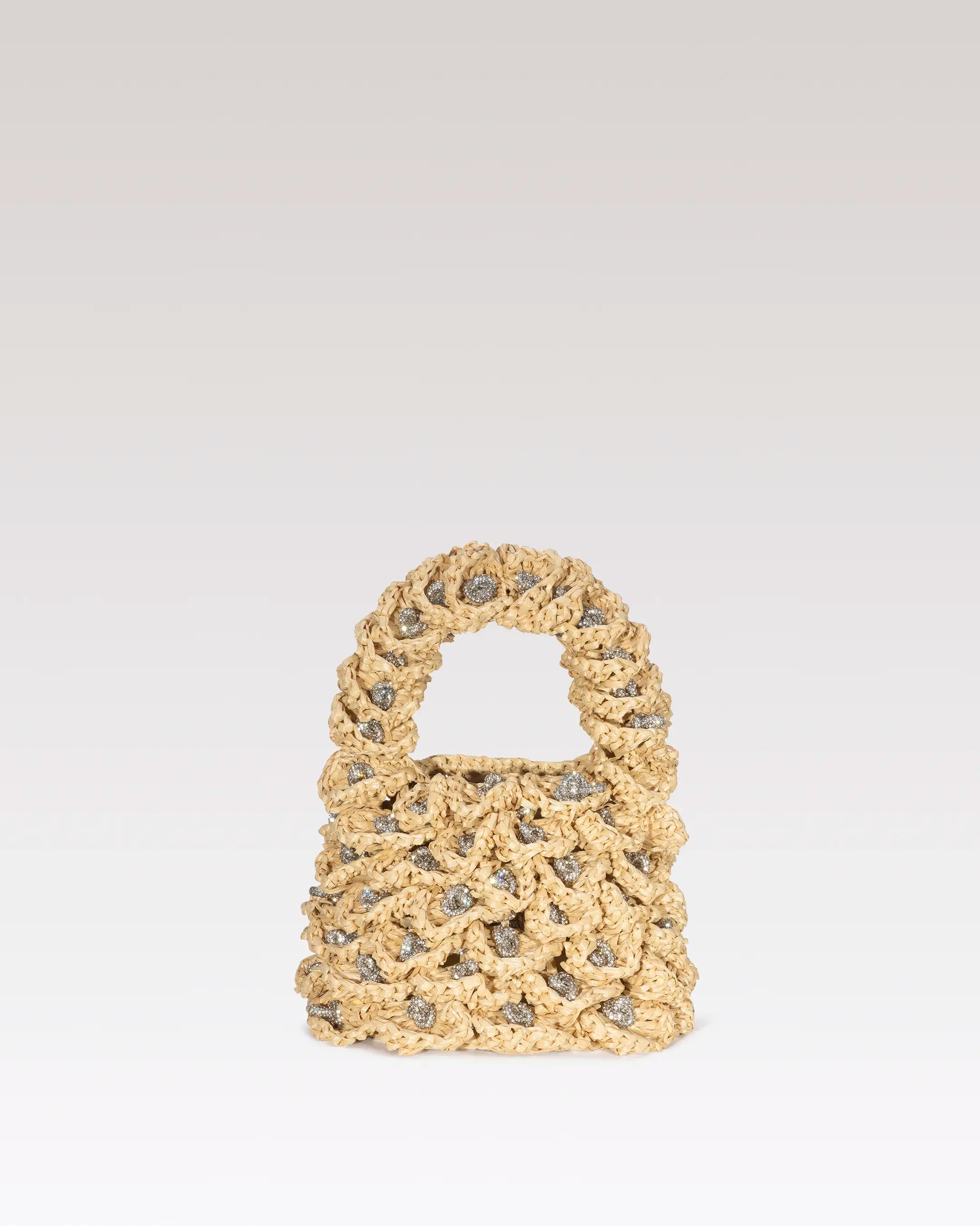 Borsa a secchiello in rafia intrecciata con cristalli luminosi