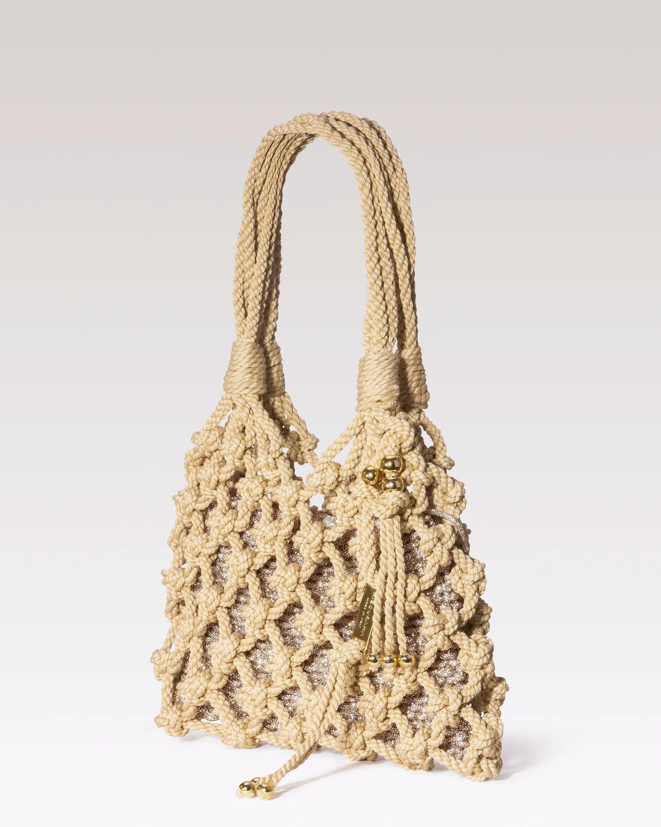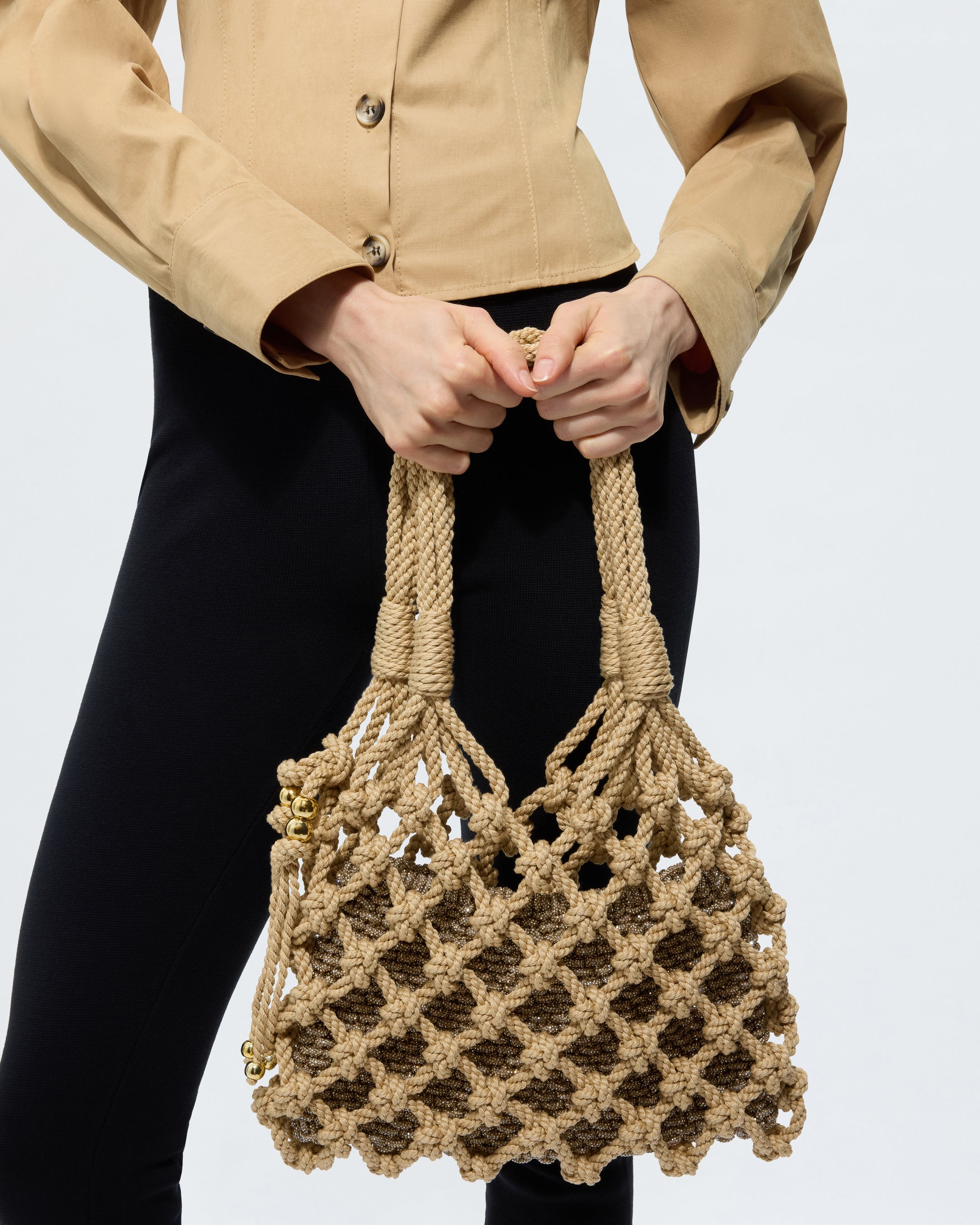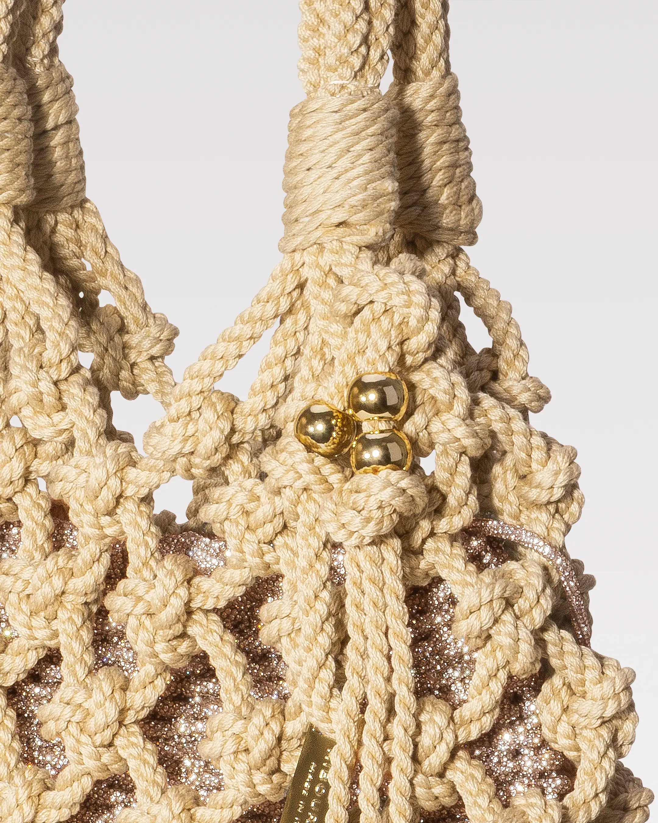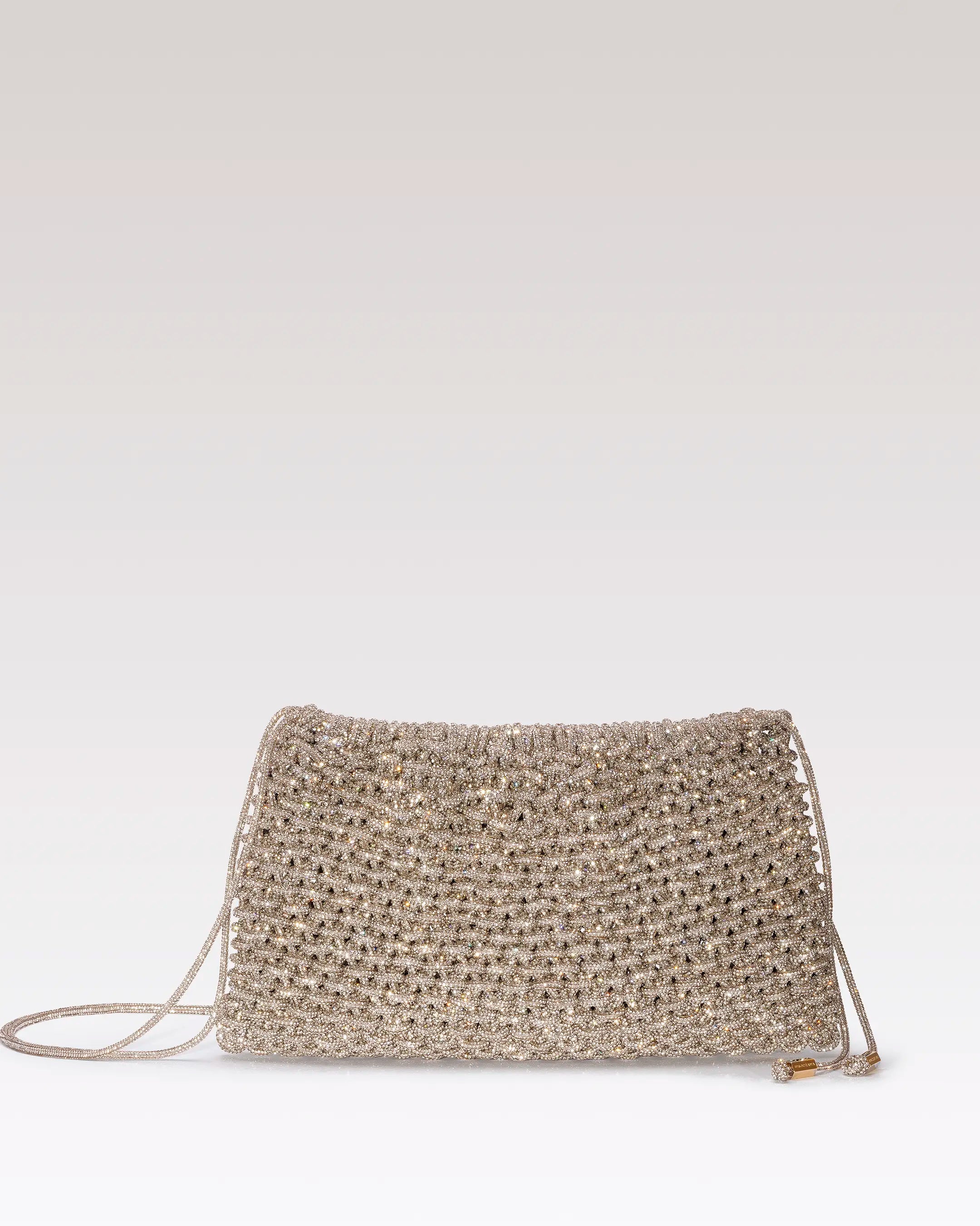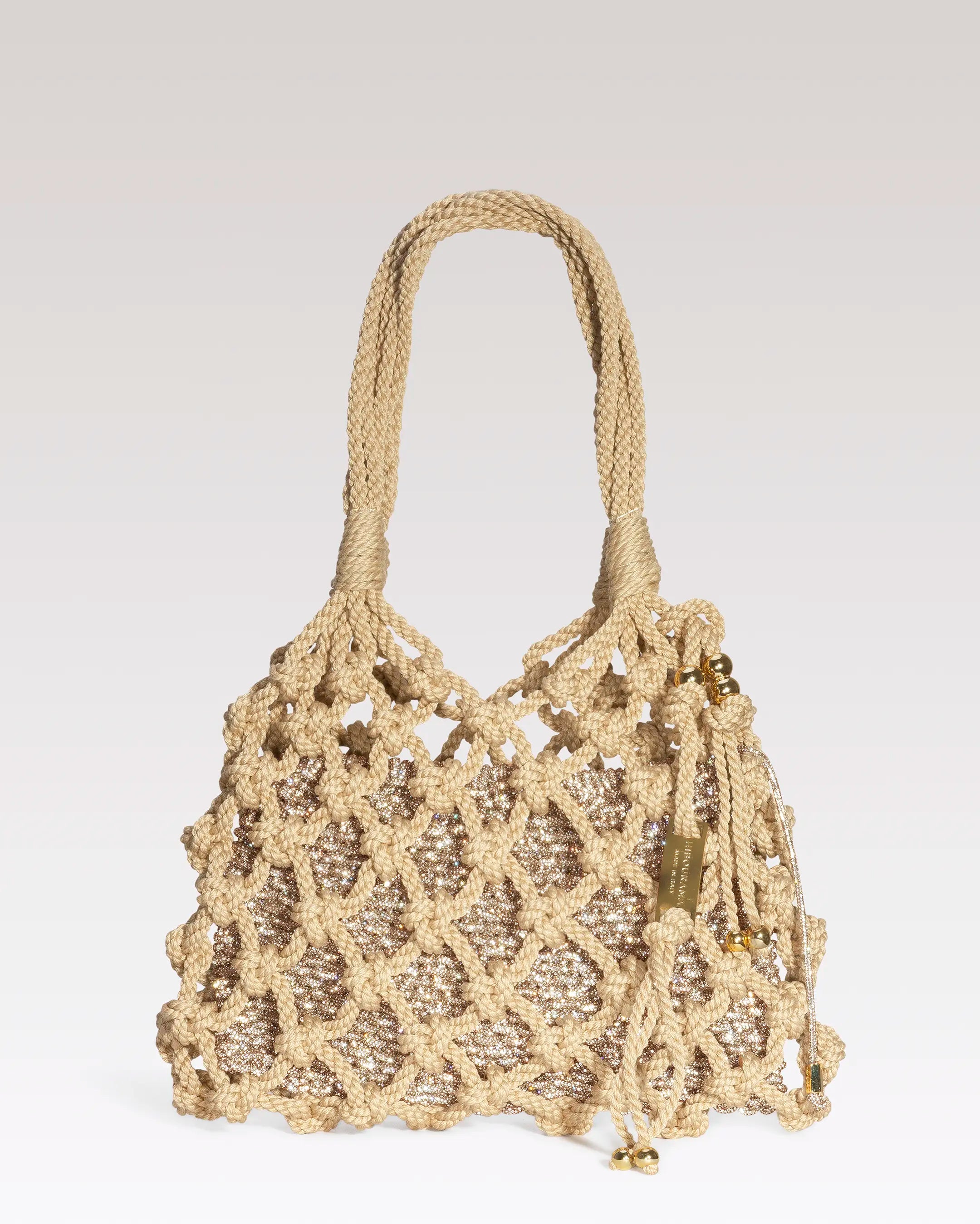 Louisa is the bag you’ve been waiting for: versatile, sophisticated, and ready to surprise you. A woven rope net wraps around a removable crystal-covered pouch—two accessories in one, why settle for less? Wear the pouch for evening, and the net as a light, cool bag for daytime. A soft, contemporary design that adapts to every moment, from brunch to party.
