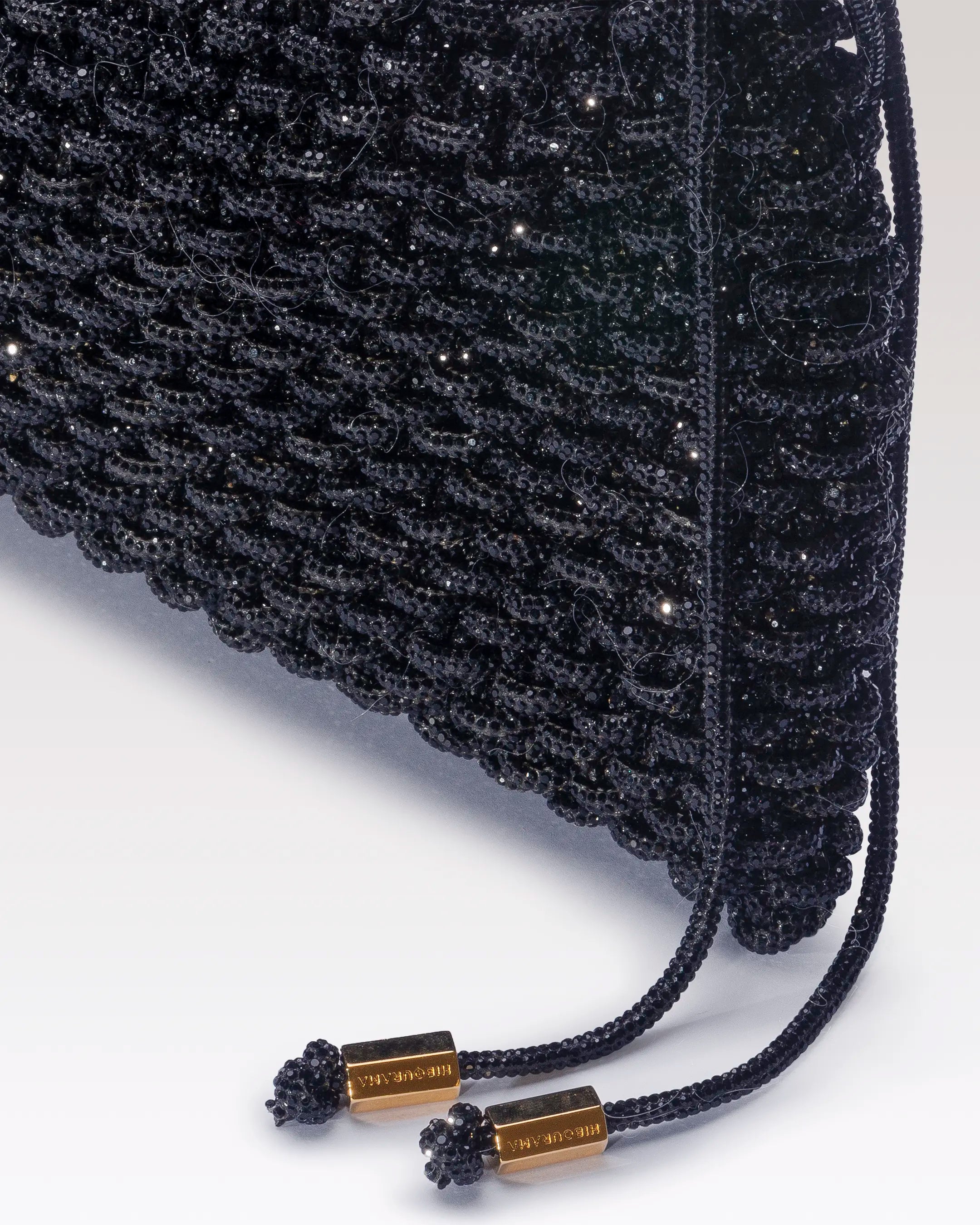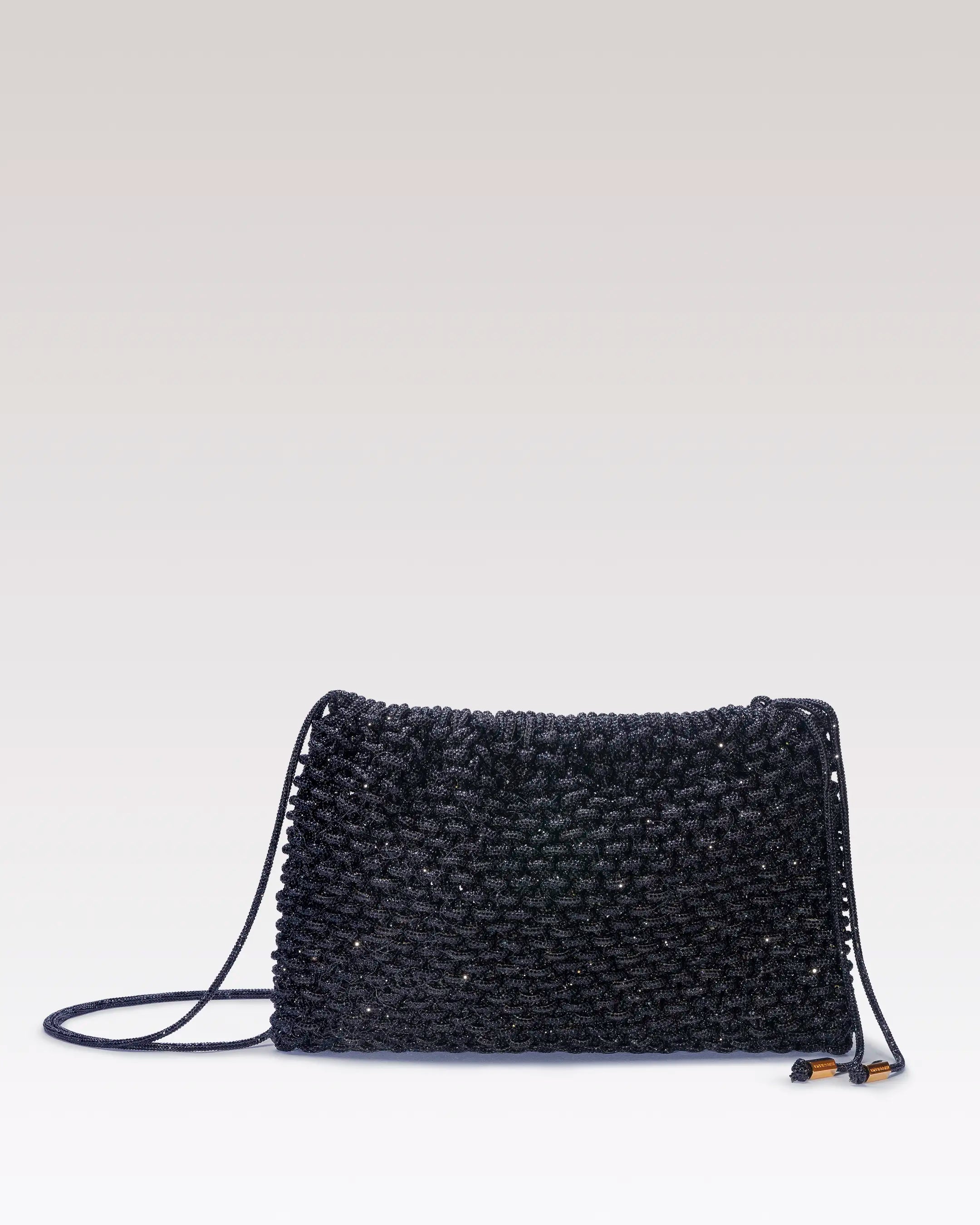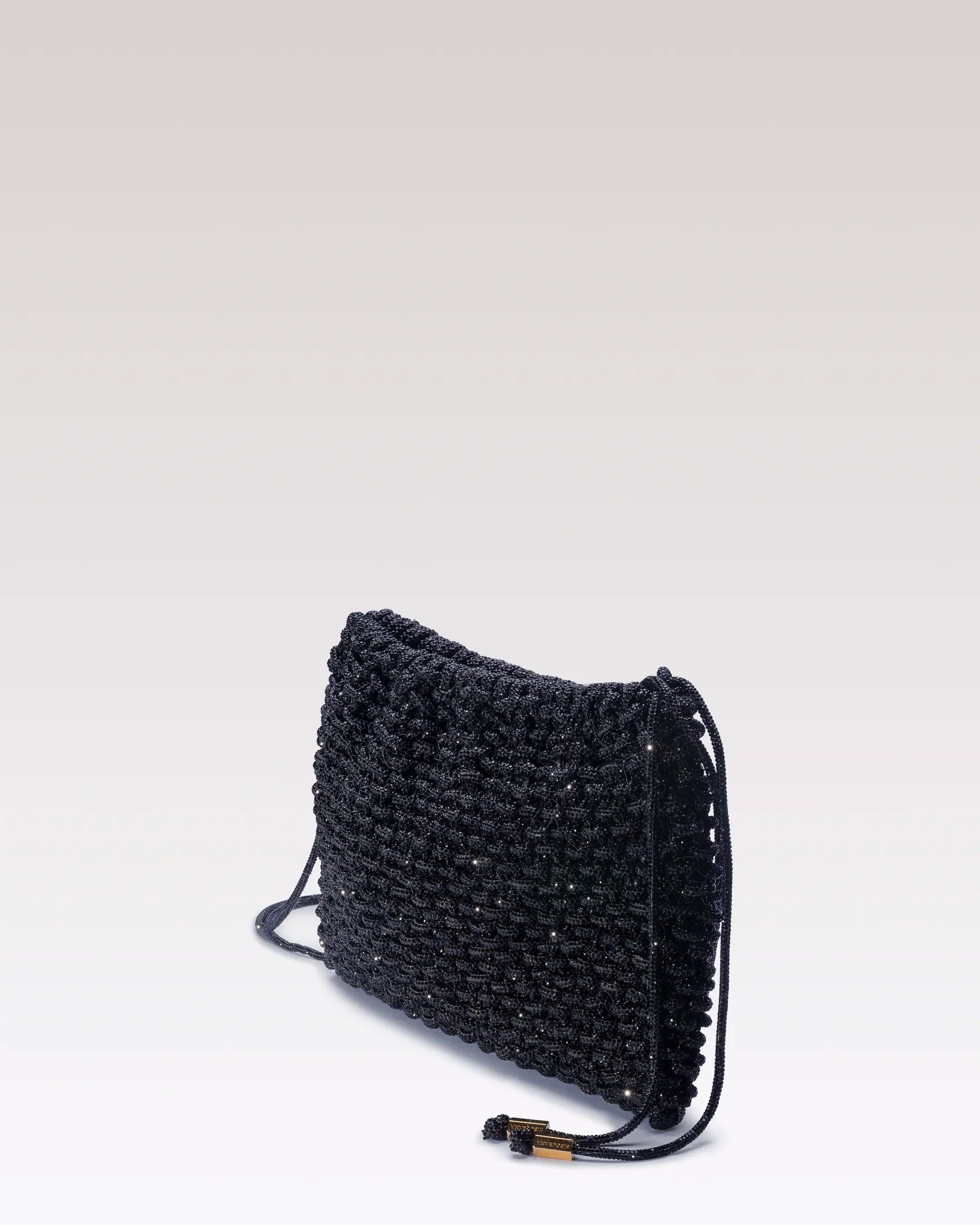 Un classico contemporaneo dalla linea essenziale e luminosa. Realizzata a mano con filati intrecciati ricoperti di cristalli, Penelope unisce morbidezza e struttura in una silhouette compatta e versatile. I cordini laterali con dettagli metallici dorati permettono di portarla a mano o a spalla, aggiungendo un tocco sofisticato ai look delle feste.