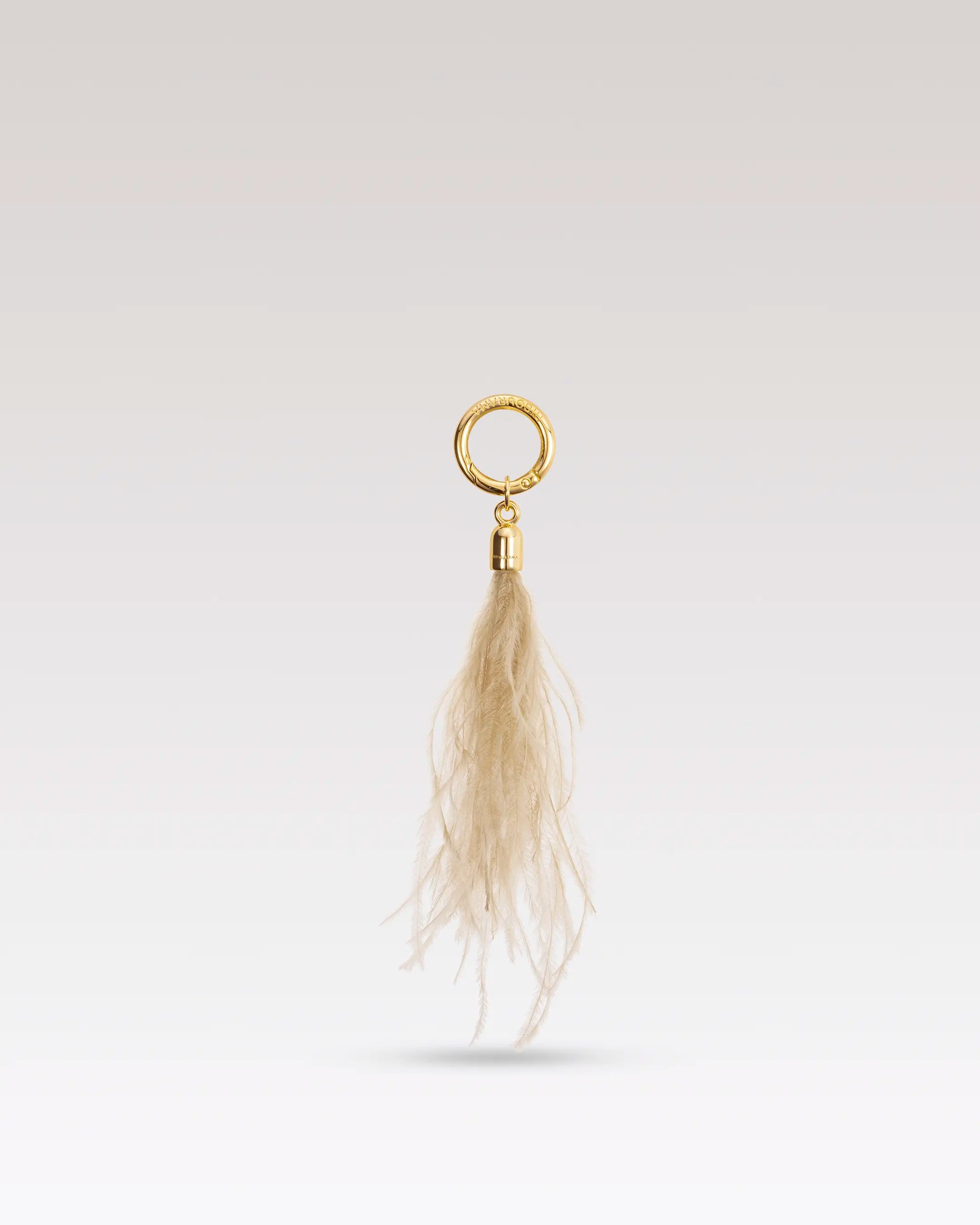 The soft feather detail creates an elegant contrast with the polished metal ring, resulting in an accessory that feels both sophisticated and playful.