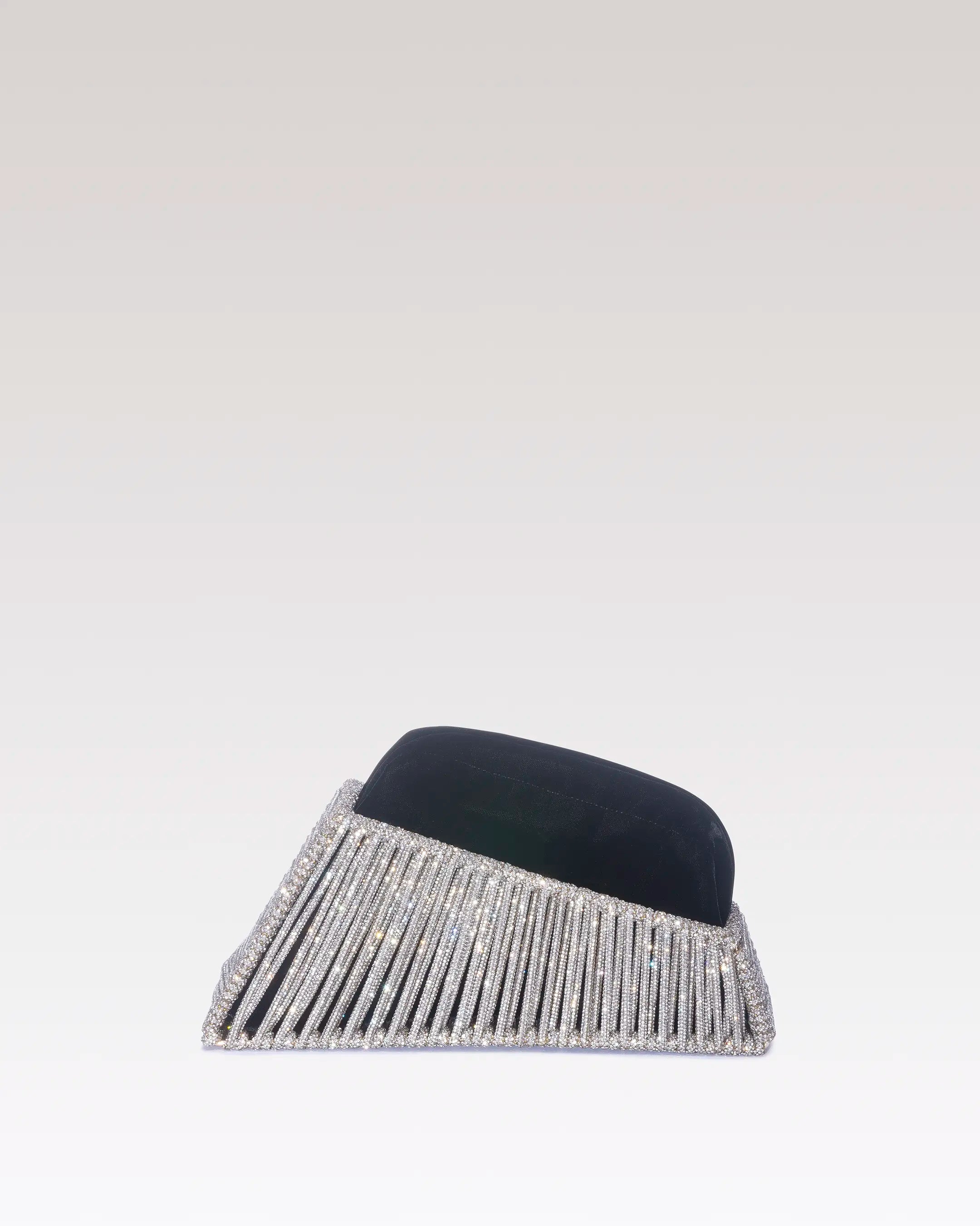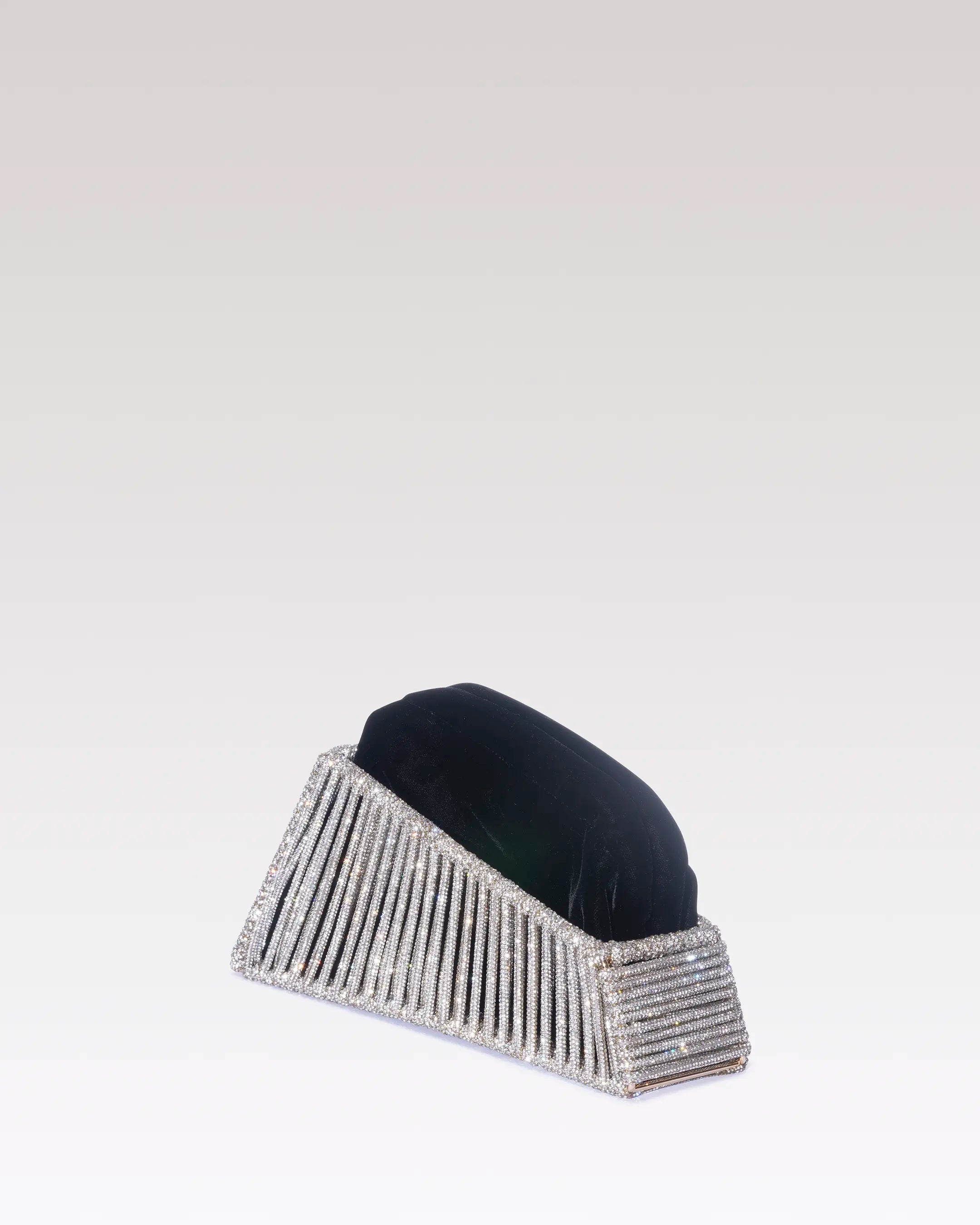 La struttura rigida, interamente ricoperta di cristalli, incontra un morbido pouch interno in velluto nero: un dialogo tra luce e materia, tra precisione architettonica e sensualità tattile.